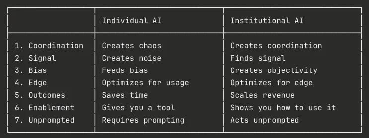 C’est sans doute parce qu’il manque à la majorité des entreprises la vision que Georges Sivulka, CEO de Hebbia (une plateforme d’IA pour la finance) a appelé “l’IA institutionnelle”. Les IA sont probabilistes, donc c’est génial pour augmenter ta productivité individuelle, mais pas assez robuste pour décupler la productivité à l’échelle de l’entreprise. Bon Georges il est forcément un peu subjectif. Mais ça reste un #MustRead, et ça va certainement te faire réfléchir encore quelque temps…
