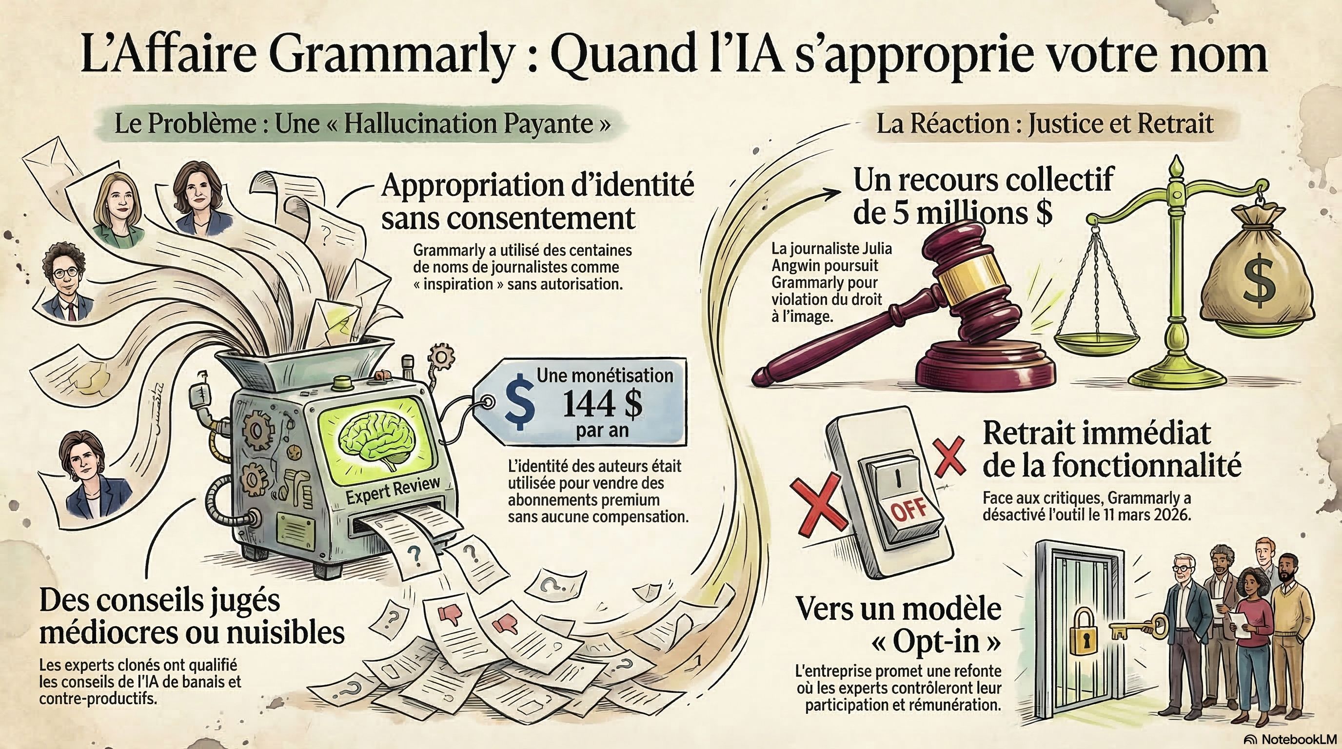 L’IA peut aussi amener les gens à faire nawak sans réfléchir. Grammarly (on devrait dire Superhuman, mais on dit encore Grammarly) a lancé une fonctionnalité appelée “Expert Review” où un expert, donc, relit ta prose. Problème ? Ces experts, cités nommément et dont les écrits sont utilisés pour revoir ton texte “à la manière de”, n’ont pas été consultés - et ne sont pas non plus rémunérés. Ni une ni deux, une plainte est déposée - d’abord par Julia Angwin, journaliste et fondatrice de The Markup, rejointe rapidement dans ce qui est en train de devenir un class action. Grammarly retire la fonctionnalité et s’excuse d’avoir été un peu trop vite… tu m’étonnes. Pendant ce temps, Nielsen attaque OpenAI pour une histoire de copyright, mais de données cette fois - et de relation metadata, ce qui est plus rare et plus intéressant à suivre.