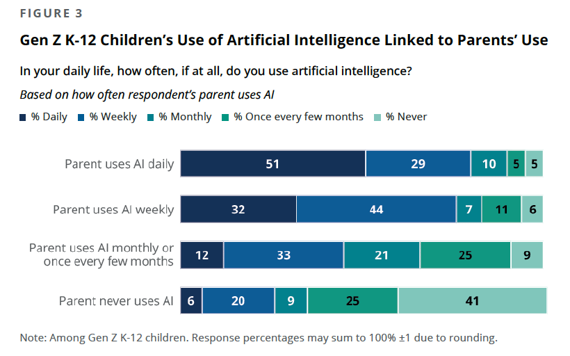 Petit d’Homme, lui, a bien compris comment ça marche, ce à quoi ça peut lui servir (il a découvert tout seul les quizz interactifs de Gemini à partir de ses cours pour réviser sa grammaire d’anglais), et ce que ça ne fait pas. Apparemment, les inégalités face à l’IA reproduisent des schémas parentaux, selon une autre étude passionnante parue récemment aussi, appelée The AI Paradox, qui étudie les comportements spécifiques de la Gen Z face à l’IA. Je t’aime, moi non plus, en est un bon résumé.